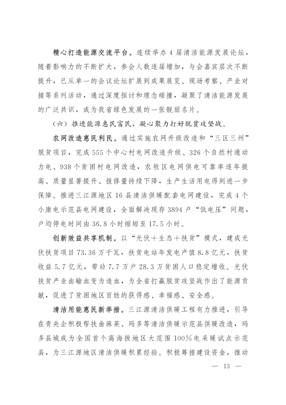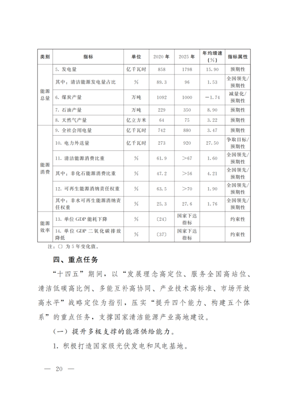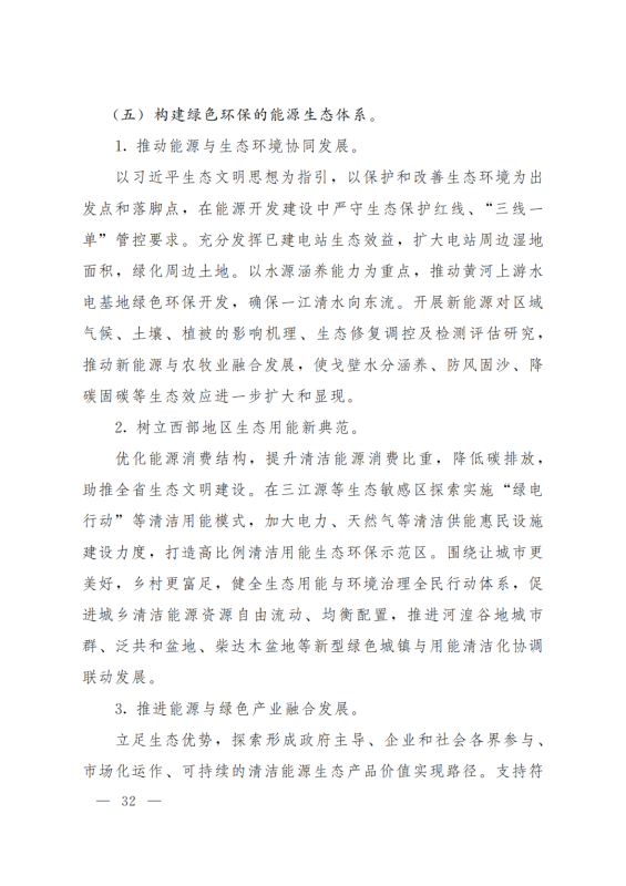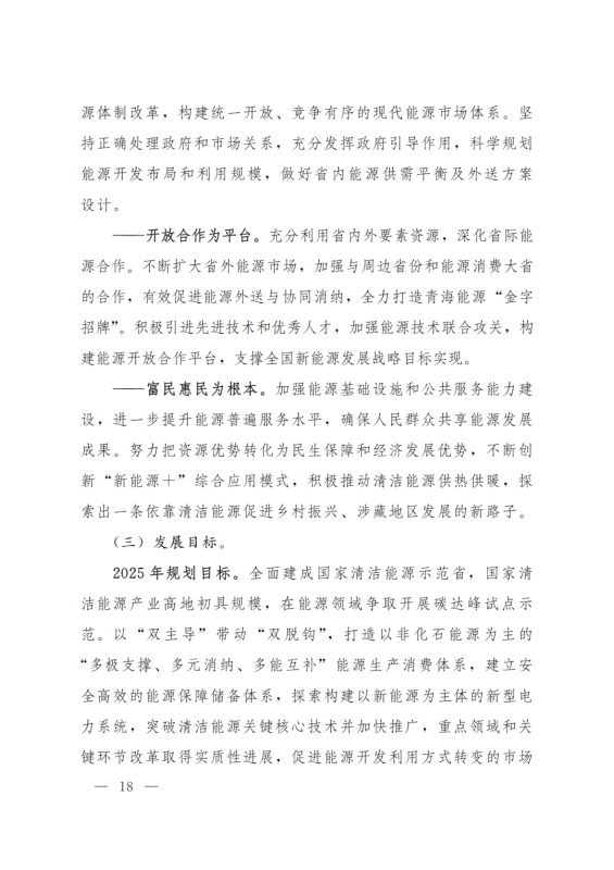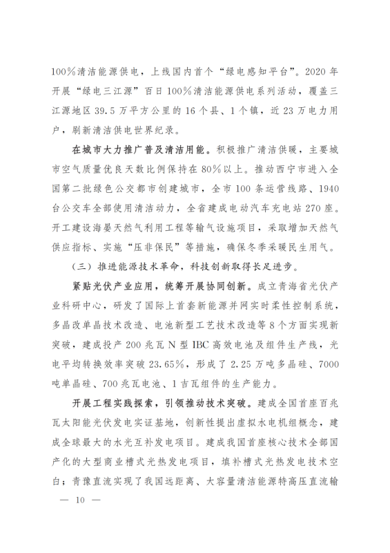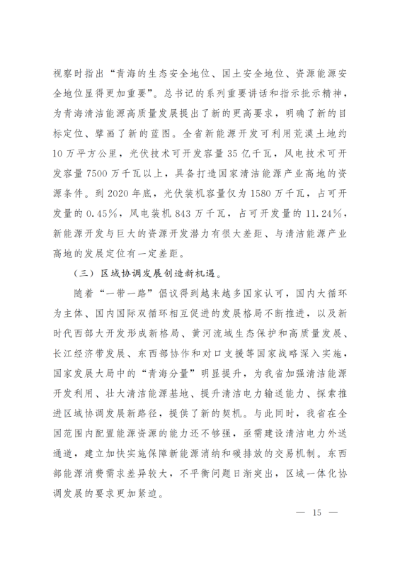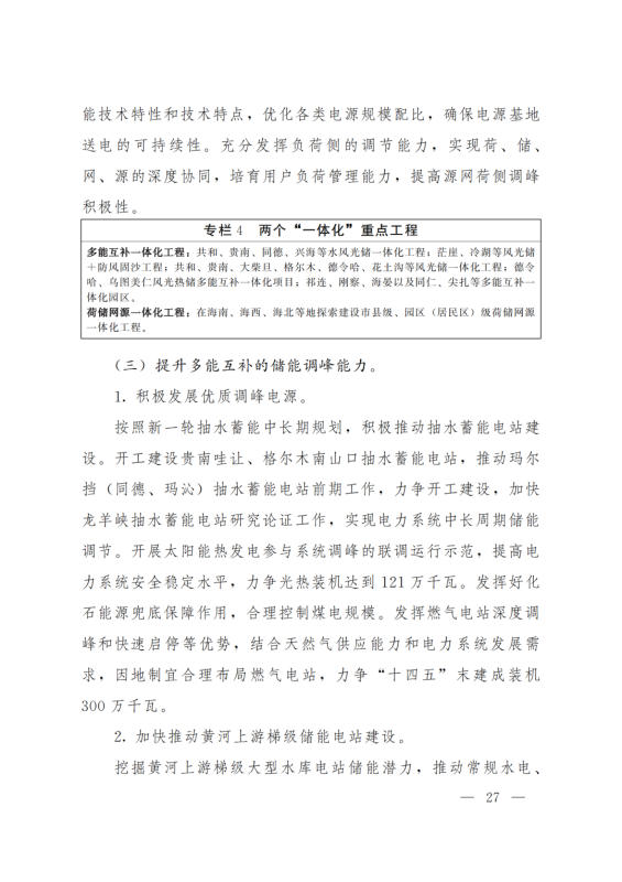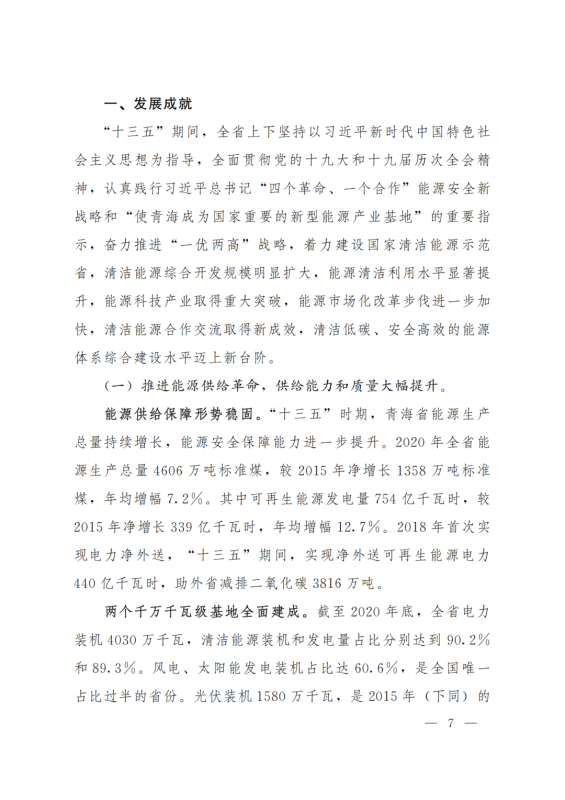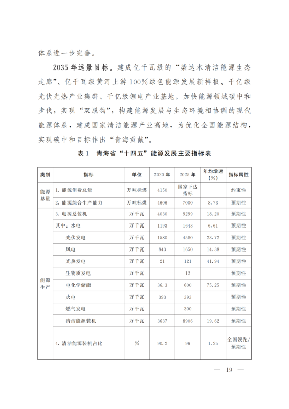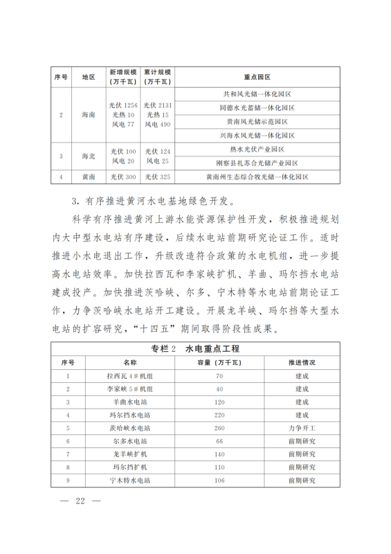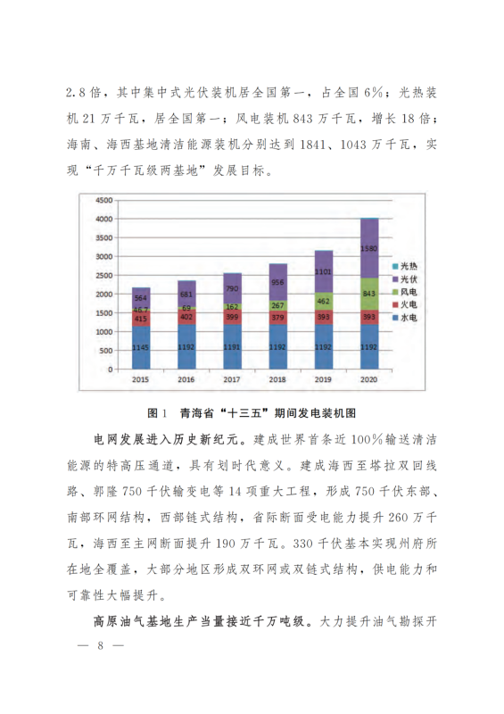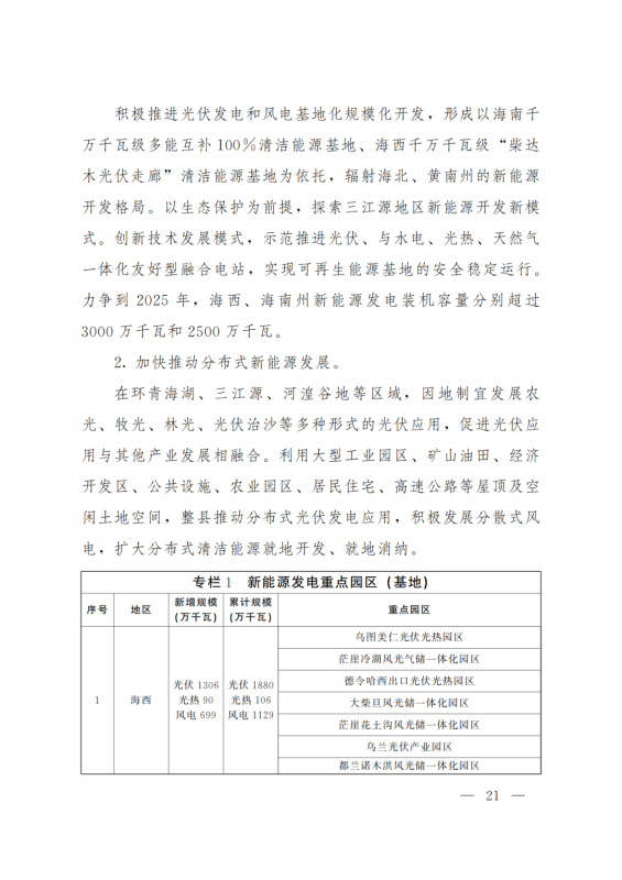 積極打造國家級(jí)光伏發(fā)電和風(fēng)電基地。積極推進(jìn)光伏發(fā)電和風(fēng)電基地化規(guī)模化開發(fā),形成以海南千萬千瓦級(jí)多能互補(bǔ)100%清潔能源基地、海西千萬千瓦級(jí)“柴達(dá)木光伏走廊”清潔能源基地為依托,輻射海北、黃南州的新能源開發(fā)格局。以生態(tài)保護(hù)為前提,探索三江源地區(qū)新能源開發(fā)新模式。創(chuàng)新技術(shù)發(fā)展模式,示范推進(jìn)光伏、與水電、光熱、天然氣一體化友好型融合電站,實(shí)現(xiàn)可再生能源基地的安全穩(wěn)定運(yùn)行。力爭(zhēng)到2025年,海西、海南州新能源發(fā)電裝機(jī)容量分別超過3000萬千瓦和2500萬千瓦。