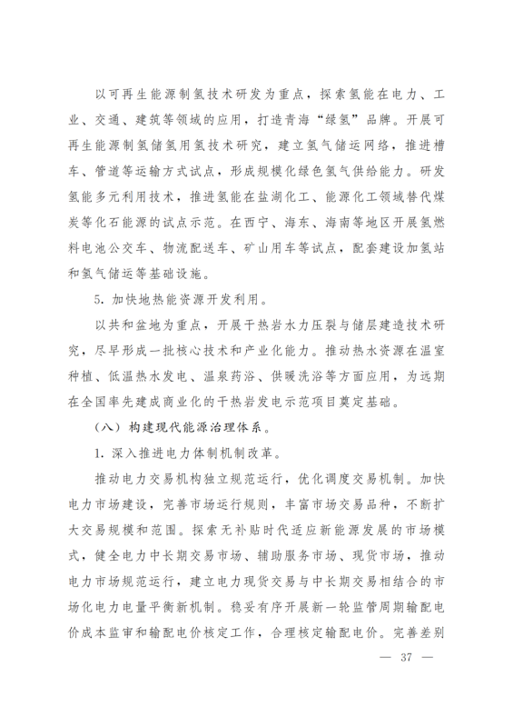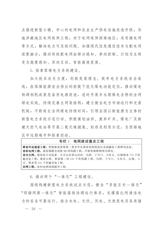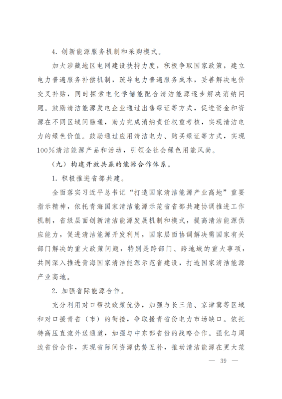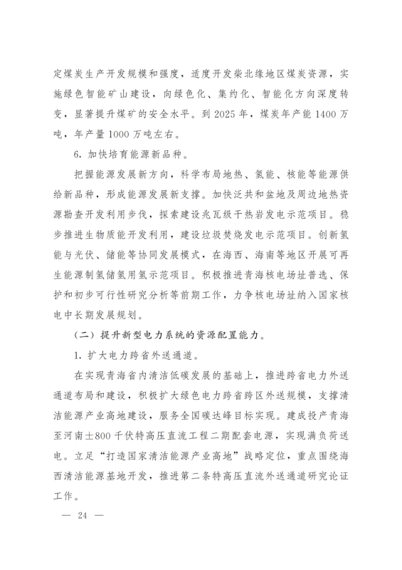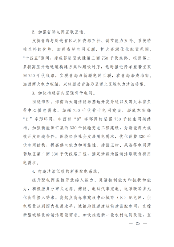 擴(kuò)大電力跨省外送通道。在實(shí)現(xiàn)青海省內(nèi)清潔低碳發(fā)展的基礎(chǔ)上,推進(jìn)跨省電力外送通道布局和建設(shè),積極擴(kuò)大綠色電力跨省跨區(qū)外送規(guī)模,支撐清潔能源產(chǎn)業(yè)高地建設(shè),服務(wù)全國碳達(dá)峰目標(biāo)實(shí)現(xiàn)。建成投產(chǎn)青海至河南±800千伏特高壓直流工程二期配套電源,實(shí)現(xiàn)滿負(fù)荷送電。立足“打造國家清潔能源產(chǎn)業(yè)高地”戰(zhàn)略定位,重點(diǎn)圍繞海西清潔能源基地開發(fā),推進(jìn)第二條特高壓直流外送通道研究論證工作。另外,加強(qiáng)省際電網(wǎng)互聯(lián)互通、加快構(gòu)建省內(nèi)堅(jiān)強(qiáng)骨干電網(wǎng)、打造清潔低碳的新型配電系統(tǒng)、探索零碳電力系統(tǒng)建設(shè)等。