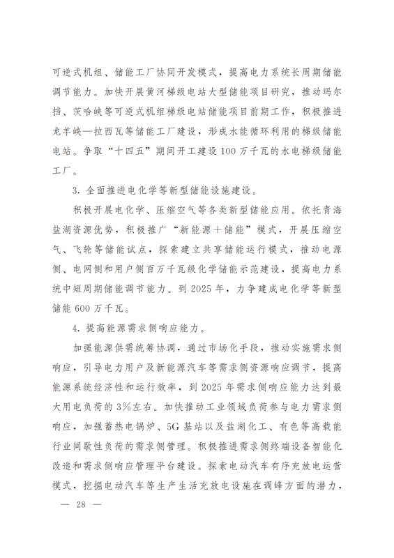 提升多能互補(bǔ)的儲(chǔ)能調(diào)峰能力。積極發(fā)展優(yōu)質(zhì)調(diào)峰電源、加快推動(dòng)黃河上游梯級(jí)儲(chǔ)能電站建設(shè)、全面推進(jìn)電化學(xué)等新型儲(chǔ)能設(shè)施建設(shè)。積極開展電化學(xué)、壓縮空氣等各類新型儲(chǔ)能應(yīng)用。依托青海鹽湖資源優(yōu)勢(shì),積極推廣“新能源+儲(chǔ)能”模式,開展壓縮空氣、飛輪等儲(chǔ)能試點(diǎn),探索建立共享儲(chǔ)能運(yùn)行模式,推動(dòng)電源側(cè)、電網(wǎng)側(cè)和用戶側(cè)百萬千瓦級(jí)化學(xué)儲(chǔ)能示范建設(shè),提高電力系統(tǒng)中短周期儲(chǔ)能調(diào)節(jié)能力。到2025年,力爭(zhēng)建成電化學(xué)等新型儲(chǔ)能600萬千瓦。