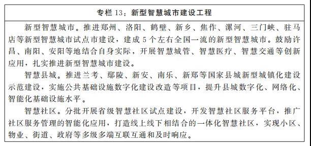 1.新型智慧城市。推動(dòng)新型智慧城市建設(shè),開(kāi)展新型智慧城市試點(diǎn)示范創(chuàng)建,實(shí)現(xiàn)城市治理智能化、集約化、人性化。推進(jìn)以省轄市、濟(jì)源示范區(qū)為主體的新型智慧城市統(tǒng)一中樞平臺(tái)建設(shè),整合公共領(lǐng)域信息系統(tǒng)和數(shù)據(jù)資源,開(kāi)展智能化創(chuàng)新應(yīng)用,提升城市綜合管理服務(wù)水平。支持基礎(chǔ)較好的地方率先建設(shè)時(shí)空大數(shù)據(jù)平臺(tái),全面推進(jìn)城市信息模型(CIM)基礎(chǔ)平臺(tái)建設(shè),打牢數(shù)字孿生城市發(fā)展根基。依托CIM平臺(tái)建立城鎮(zhèn)住宅房屋“一樓一檔”,對(duì)接城鎮(zhèn)房屋網(wǎng)格化巡查功能。建立房屋安全在線監(jiān)測(cè)體系,構(gòu)建智慧物業(yè)服務(wù)模式,提升房屋使用安全管理水平。推進(jìn)標(biāo)準(zhǔn)化、規(guī)范化智慧小區(qū)建設(shè),打造綜合集成社區(qū)服務(wù)和管理功能的一體化智慧社區(qū)。加快縣城智慧化改造,聚焦補(bǔ)短板強(qiáng)弱項(xiàng),推進(jìn)縣域新型智慧城市建設(shè)全面展開(kāi)。