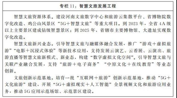 4.智慧文旅。圍繞文旅文創(chuàng)融合發(fā)展戰(zhàn)略,講好河南故事、弘揚(yáng)黃河文化,持續(xù)推進(jìn)景區(qū)、酒店、旅行社、鄉(xiāng)村旅游點(diǎn)以及文博場(chǎng)館智慧化改造,打造一批高等級(jí)智慧景區(qū)、文化場(chǎng)館和博物館。全面推動(dòng)非遺傳承、文物古跡線上展示,高質(zhì)量實(shí)施文物活化和數(shù)字文化工程。推動(dòng)5G、物聯(lián)網(wǎng)、人工智能、云計(jì)算等在文化和旅游領(lǐng)域創(chuàng)新應(yīng)用與示范,加快發(fā)展新型文化企業(yè)、文化業(yè)態(tài)、文化消費(fèi)模式,豐富和優(yōu)化數(shù)字旅游產(chǎn)品與服務(wù)供給,構(gòu)建智慧文旅新體系。利用互聯(lián)網(wǎng)和新媒體加強(qiáng)文化、旅游宣介。