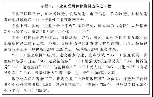 1.工業(yè)互聯(lián)網(wǎng)。加強(qiáng)工廠內(nèi)外網(wǎng)建設(shè),提高網(wǎng)絡(luò)傳輸和感知水平,強(qiáng)化5G網(wǎng)絡(luò)部署。以裝備制造、食品等優(yōu)勢(shì)行業(yè)為重點(diǎn)推進(jìn)標(biāo)識(shí)解析二級(jí)節(jié)點(diǎn)建設(shè),加快洛陽(yáng)、許昌、漯河、鄭州等工業(yè)互聯(lián)網(wǎng)標(biāo)識(shí)解析體系二級(jí)節(jié)點(diǎn)推廣應(yīng)用。深入實(shí)施工業(yè)互聯(lián)網(wǎng)創(chuàng)新發(fā)展工程,推動(dòng)“5G+人工智能+工業(yè)互聯(lián)網(wǎng)”融合應(yīng)用,建設(shè)“1+N+N”工業(yè)互聯(lián)網(wǎng)平臺(tái)體系,培育建設(shè)1個(gè)跨行業(yè)、跨領(lǐng)域綜合性平臺(tái),N個(gè)細(xì)分行業(yè)、特定領(lǐng)域平臺(tái),N個(gè)優(yōu)勢(shì)產(chǎn)業(yè)集群平臺(tái),加快建設(shè)國(guó)家工業(yè)互聯(lián)網(wǎng)平臺(tái)應(yīng)用創(chuàng)新推廣中心。推進(jìn)河南省工業(yè)互聯(lián)網(wǎng)安全技術(shù)平臺(tái)建設(shè),建設(shè)工業(yè)互聯(lián)網(wǎng)安全資源庫(kù)、安全測(cè)試驗(yàn)證環(huán)境。持續(xù)推進(jìn)“上云用數(shù)賦智”行動(dòng),鼓勵(lì)中小企業(yè)業(yè)務(wù)系統(tǒng)向云端遷移,打造資源富集、良性互動(dòng)的工業(yè)互聯(lián)網(wǎng)平臺(tái)生態(tài)。支持軟件企業(yè)、工業(yè)企業(yè)、科研院所等開(kāi)展合作,培育一批面向特定行業(yè)、特定場(chǎng)景的工業(yè)APP(應(yīng)用程序)。建設(shè)河南省工業(yè)互聯(lián)網(wǎng)大數(shù)據(jù)中心,爭(zhēng)取建設(shè)國(guó)家工業(yè)互聯(lián)網(wǎng)大數(shù)據(jù)分中心。