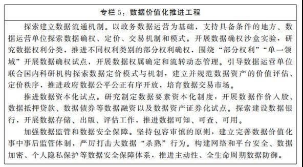 (二)探索建立數(shù)據(jù)價(jià)值體系。開(kāi)展數(shù)據(jù)要素價(jià)值化試點(diǎn),加強(qiáng)數(shù)據(jù)標(biāo)準(zhǔn)制定、確權(quán)、定價(jià)、流通、資本化、監(jiān)管研究,探索建立數(shù)據(jù)流通機(jī)制、應(yīng)用體系、監(jiān)管與安全體系,推進(jìn)數(shù)據(jù)由資源化向資產(chǎn)化、資本化過(guò)渡,建設(shè)數(shù)據(jù)價(jià)值化試驗(yàn)基地。到2025年,數(shù)據(jù)價(jià)值體系基本建成,數(shù)據(jù)作為生產(chǎn)要素全面參與生產(chǎn)分配,在政務(wù)數(shù)據(jù)開(kāi)放應(yīng)用以及農(nóng)業(yè)、物流、文旅等優(yōu)勢(shì)行業(yè)領(lǐng)域數(shù)據(jù)價(jià)值化應(yīng)用全國(guó)領(lǐng)先。