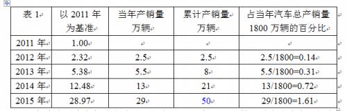 純電動汽車和插電式混合動力汽車2015年累計產銷量50萬輛,分在4年內生產,可以推算出要求這4年內每年產銷量的平均增幅為132%。在這樣的平均增幅下,可以算出2012-2015各年的當年產銷量分別為2.5、5.5、13和29萬輛。各年的累計產銷量也一并見表1?! ?/div>