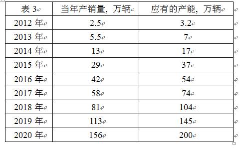 到2020年純電動汽車和插電式混合動力汽車生產能力要求達200萬輛。由于當年新增的電動汽車和插電式混合動力汽車生產能力在當年內難以充分發(fā)揮作用,當年產銷量要低于可達的年生產能力。以2020年為例,這兩個數分別為156萬和200萬,即當年產銷量約為可達年生產能力的78%。