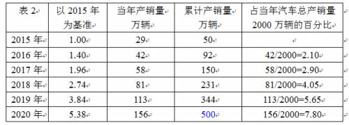 2020年純電動汽車和插電式混合動力汽車累計產銷量超過500萬輛,即5年內累計共應生產450萬輛車。以2015年為基準,可以推算出要求這5年內每年產銷量的平均增幅應為40%。在這樣的平均增幅下,可以算出2016-2020各年的當年產銷量分別為42、58、81、113和156萬輛。各年的累計產銷量也一并見表2?! ?/div>