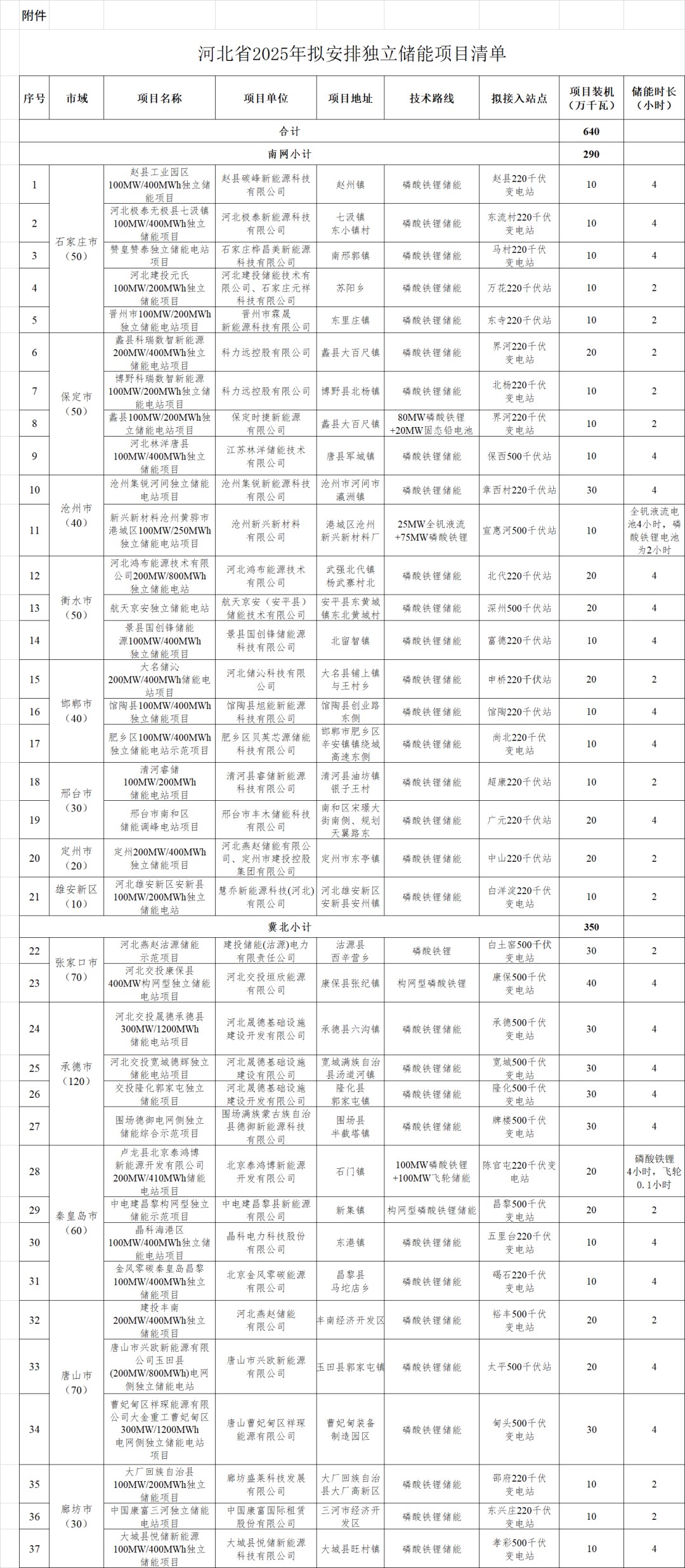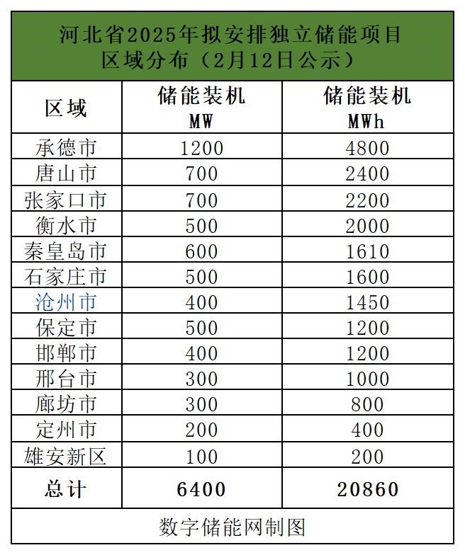 2月12日,河北省發(fā)改委發(fā)布《河北省2025年擬安排獨立儲能項目情況公示》,共公示獨立儲能項目37個、裝機容量6.4GW/20.86GWh。