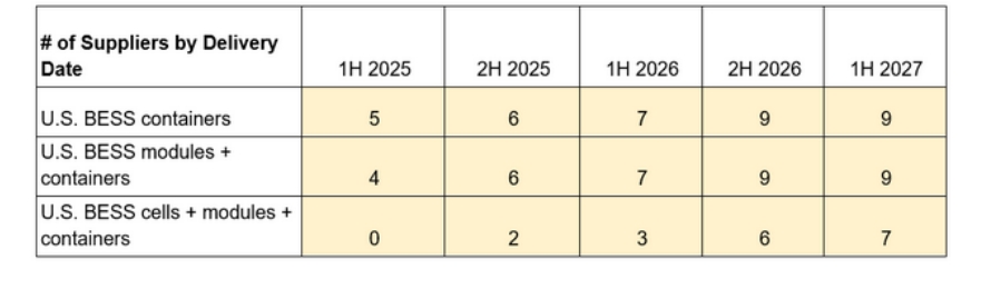 根據(jù)該公司研究,目前,美國(guó)擁有5家集裝箱式電池儲(chǔ)能系統(tǒng)制造商,而這一數(shù)字預(yù)計(jì)將在2027年上半年增長(zhǎng)至9家。此外,2025年下半年,美國(guó)將會(huì)迎來(lái)兩家新的電池、模塊、電池儲(chǔ)能系統(tǒng)解決方案供應(yīng)商,到2027年上半年,此類(lèi)供應(yīng)商的數(shù)量將進(jìn)一步增長(zhǎng)至7家。