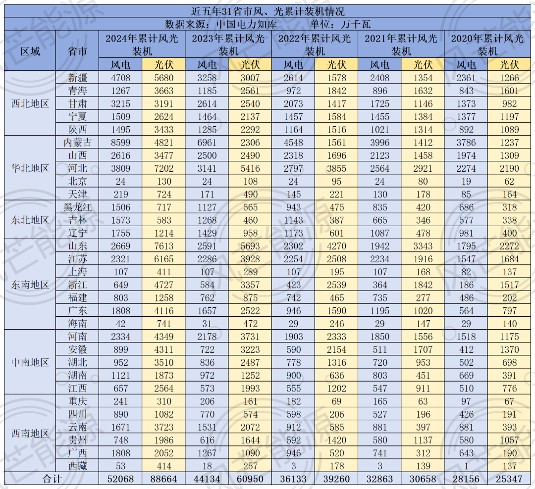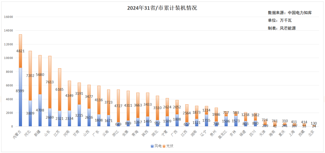 分地區(qū)來看,內(nèi)蒙古、河北、新疆及山東4省風(fēng)、光累計裝機突破1億千瓦;超5成地區(qū)風(fēng)、光裝機突破4000萬千瓦;8成地區(qū)新能源裝機超1000萬千瓦。