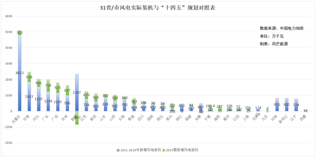 注:部分省份未明確“十四五”新增風(fēng)電裝機容量,故圖中未顯示2025年需新增風(fēng)電裝機數(shù)據(jù)