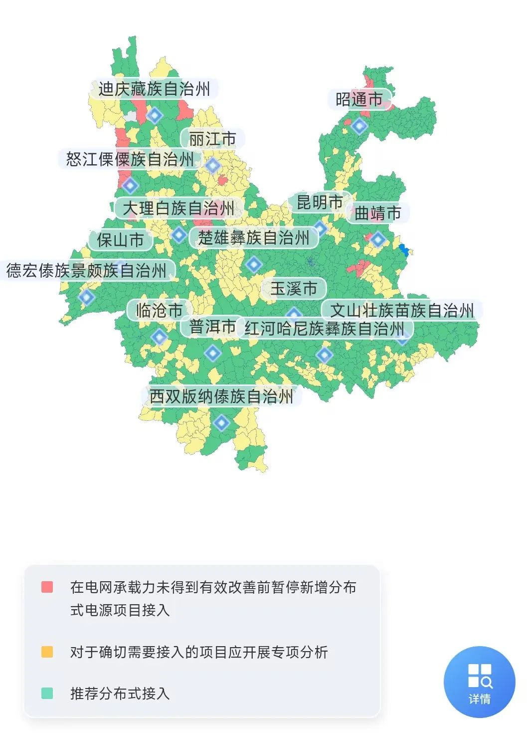 目前,全省129個縣(市、區(qū))中,官渡區(qū)、呈貢區(qū)等97個區(qū)域為綠色,代表當(dāng)?shù)胤植际焦夥娋W(wǎng)接入條件良好,可即裝即并、就地消納;麒麟?yún)^(qū)、勐海縣等30個區(qū)域為黃色,代表當(dāng)?shù)匾褵o消納能力,電網(wǎng)接入困難,分布式光伏建設(shè)前需開展接入電網(wǎng)分析;賓川縣、福貢縣等2個區(qū)域為紅色,意味著在電網(wǎng)承載力有效改善前,暫停新增分布式光伏接入。
