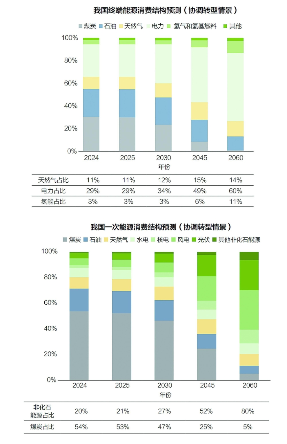 “2”是指“十五五”時期,預(yù)計由新動能驅(qū)動的能源需求增長,快于傳統(tǒng)行業(yè)轉(zhuǎn)型帶來的用能壓減,能源消費(fèi)總量將保持增長但增速有望回落至2%左右。在協(xié)調(diào)轉(zhuǎn)型情景下,到2030年,我國一次能源消費(fèi)總量將增至67.5億噸標(biāo)準(zhǔn)煤,煤炭消費(fèi)占比跌至46.5%,油氣消費(fèi)合計占比穩(wěn)定在26%以上,非化石能源占比達(dá)27%。