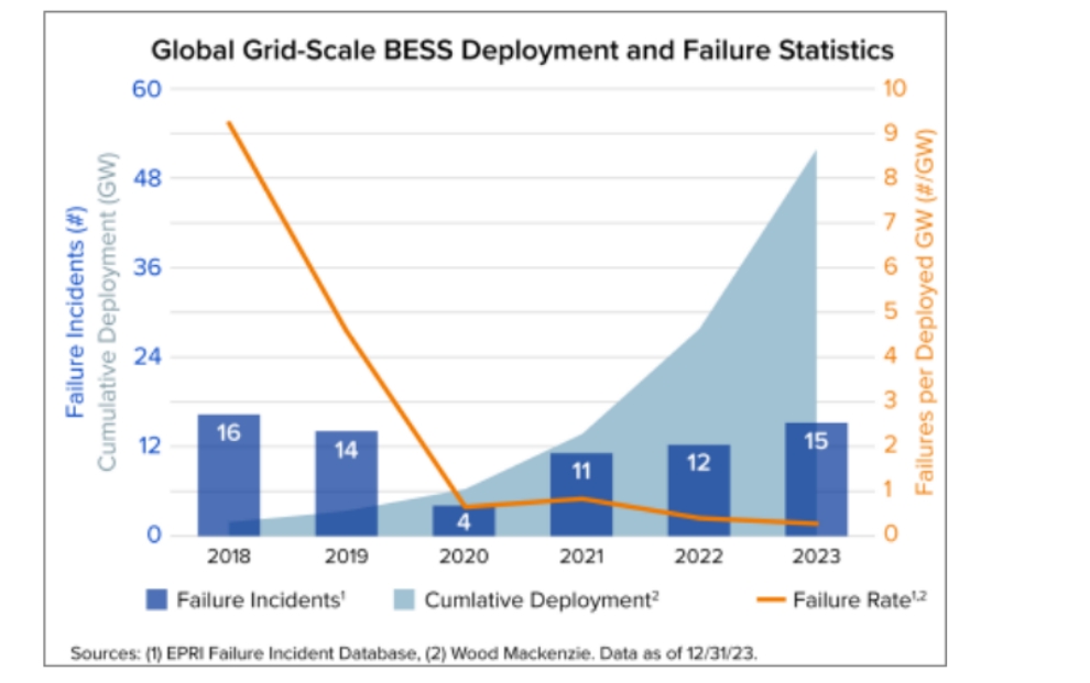圖1:EPRI公司和Wood Mackenzie公司發(fā)布的全球電網(wǎng)規(guī)模電池儲(chǔ)能系統(tǒng)部署及故障統(tǒng)計(jì)數(shù)據(jù)