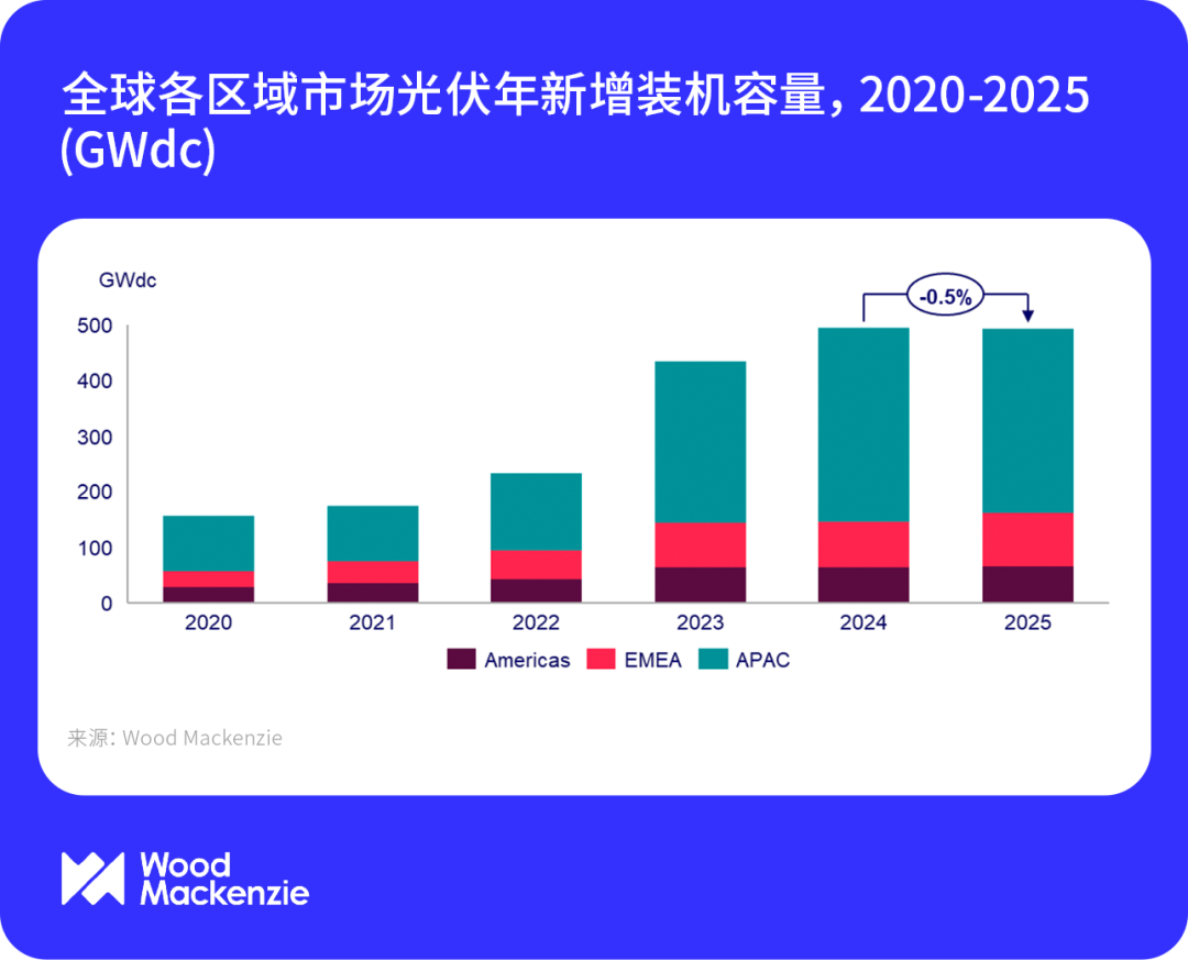 中國(guó)儲(chǔ)能網(wǎng)訊:2024年全球光伏市場(chǎng)延續(xù)增長(zhǎng)態(tài)勢(shì),新增裝機(jī)容量達(dá)到495GWdc,同比增長(zhǎng)14%。由于數(shù)據(jù)中心的激增和電氣化趨勢(shì)的增強(qiáng),全球各地區(qū)的電力需求都將上升。然而,受制于政策的不確定性、區(qū)域保護(hù)主義的抬頭以及并網(wǎng)瓶頸等因素,即便在當(dāng)前組件供應(yīng)過(guò)剩的情況下,也會(huì)使全球光伏市場(chǎng)年度增長(zhǎng)趨勢(shì)受挫。這些限制因素以及各區(qū)域市場(chǎng)的動(dòng)態(tài)變化,將導(dǎo)致2025年全球光伏新增裝機(jī)容量降至493GWdc,同比略有縮減。