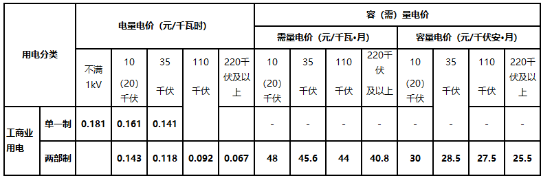 備注:單一制和兩部制電價。單一制電價只按電量計算輸配電費。兩部制電價包括容(需)量電價和電量電價兩部分,容(需)量相對固定,用戶可根據(jù)自身用電特性選擇按容量或者最大需量繳納,其中,容量是指用戶使用的變壓器容量,需量是指用戶在一定時間內(nèi)的最大電力需求量。用電容量315千伏安及以上的用戶執(zhí)行兩部制電價。