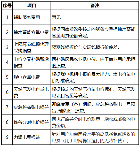 4.系統(tǒng)運行費用。主要用于歸集和疏導(dǎo)電力系統(tǒng)調(diào)節(jié)性成本,主要包括輔助服務(wù)費用、抽水蓄能容量電費等9項(詳見表2),根據(jù)國家核定或電力實際運行產(chǎn)生,按月核定,不同月份費用不同。一般在0.02—0.04元/千瓦時。