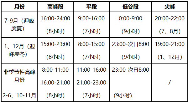 電價浮動比例:低谷段電價在用戶購電價格加輸配電價基礎(chǔ)上下浮61.8%;季節(jié)性(1月、7—9月、12月)高峰電價上浮84.3%,其他月份高峰電價上浮74%。尖峰電價在高峰電價基礎(chǔ)上上浮20%。