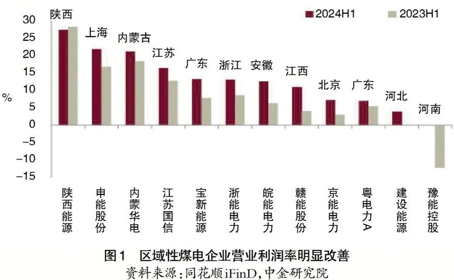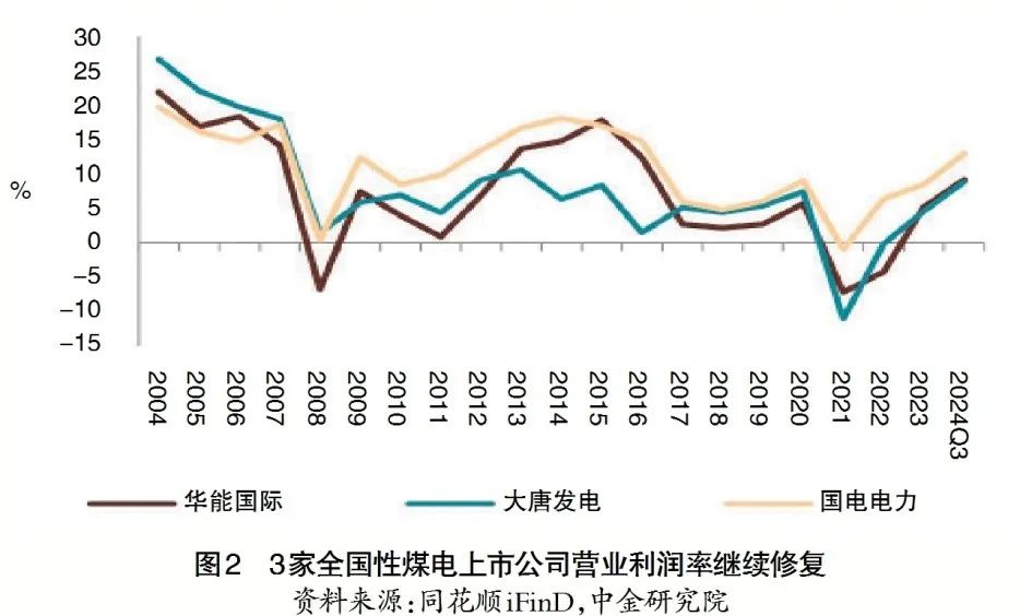 煤電容量電價(jià)政策自2024年1月1日起實(shí)施,旨在回收部分固定成本、穩(wěn)定煤電行業(yè)預(yù)期,保障煤電更好發(fā)揮支撐調(diào)節(jié)價(jià)值。在過(guò)去幾年部分煤電機(jī)組虧損的背景下,容量電價(jià)也有望幫助其扭虧為盈,特別是有助于推動(dòng)煤-電矛盾突出、煤電轉(zhuǎn)型較快地區(qū)、運(yùn)行時(shí)間較短的煤電機(jī)組扭虧為盈(見圖1),起到“雪中送炭”的作用。從實(shí)際經(jīng)營(yíng)數(shù)據(jù)看,2024年,煤電企業(yè)的營(yíng)業(yè)利潤(rùn)率普遍有所修復(fù),例如華能國(guó)際、大唐發(fā)電、國(guó)電電力這3家全國(guó)性煤電上市公司的營(yíng)業(yè)利潤(rùn)率在2024年前三季度在10%左右(見圖2),落入了中金研究院在2024年初發(fā)布的《新型電力系統(tǒng)電價(jià)機(jī)制:保障煤電發(fā)揮支撐調(diào)節(jié)價(jià)值》中提出的合理利潤(rùn)率區(qū)間。