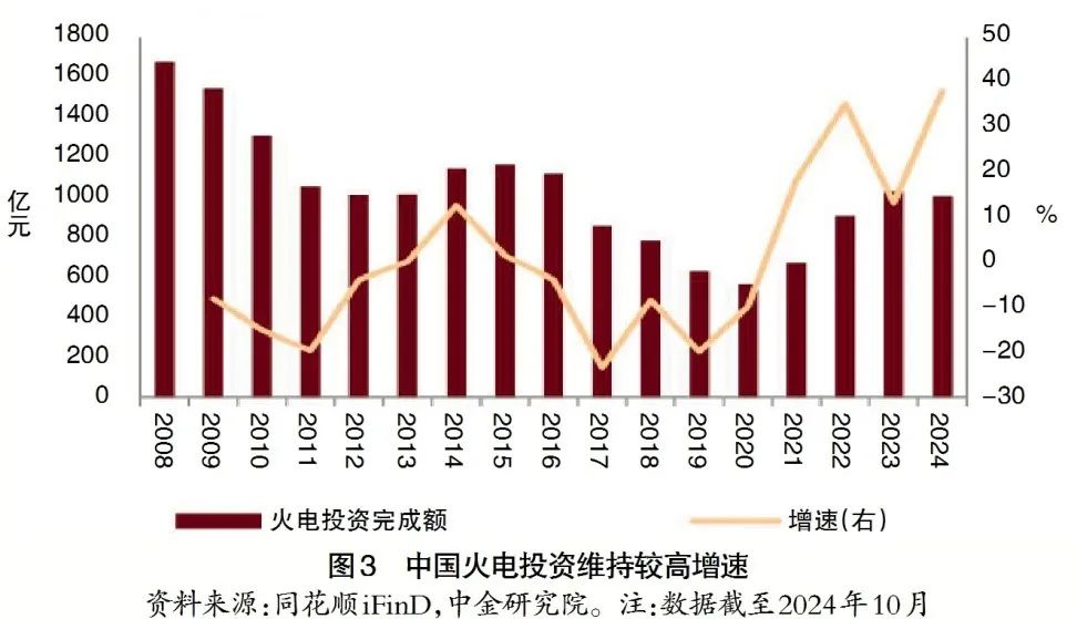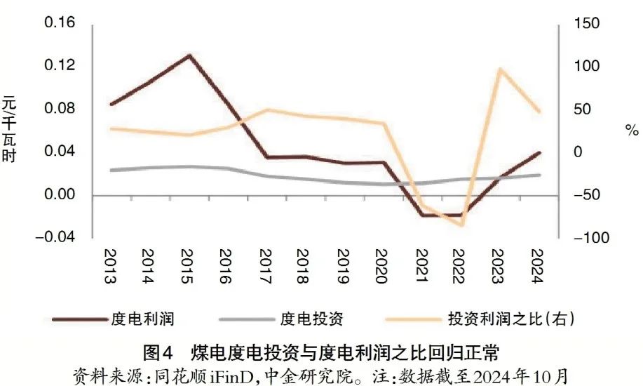 煤電企業(yè)利潤(rùn)率的修復(fù)有利于支撐近年來(lái)持續(xù)高位的煤電投資(見圖3)。2021年來(lái),部分地區(qū)出現(xiàn)電力供應(yīng)緊張甚至限電現(xiàn)象,煤電對(duì)于電力保供的價(jià)值再次凸顯,隨之而來(lái)的是煤電裝機(jī)核準(zhǔn)量和相關(guān)投資快速增長(zhǎng)。但2021~2023年煤電企業(yè)在高煤價(jià)的壓制下依然存在較大的經(jīng)營(yíng)壓力,難以支撐快速增長(zhǎng)的新增投資,我們可以用度電投資與度電利潤(rùn)之比衡量企業(yè)利潤(rùn)中用于投資的比例,這一指標(biāo)越高說(shuō)明利潤(rùn)支撐投資的壓力越大(見圖4)。我們測(cè)算發(fā)現(xiàn),近年來(lái)度電投資與度電利潤(rùn)之比大幅偏離過(guò)去的平均水平(為40%左右),其中2021和2022年我們估算全國(guó)煤電企業(yè)平均度電利潤(rùn)為負(fù)值,2023年度電利潤(rùn)雖然轉(zhuǎn)正,但度電投資與度電利潤(rùn)之比接近100%,這意味著企業(yè)當(dāng)年幾乎沒有剩余利潤(rùn)用于償還債務(wù)、股東分紅,或留存以應(yīng)對(duì)未來(lái)不確定性或投資機(jī)會(huì)。2024年,我們測(cè)算煤電企業(yè)的度電投資與度電利潤(rùn)之比逐步回歸正常,有利于煤電高質(zhì)量健康發(fā)展。