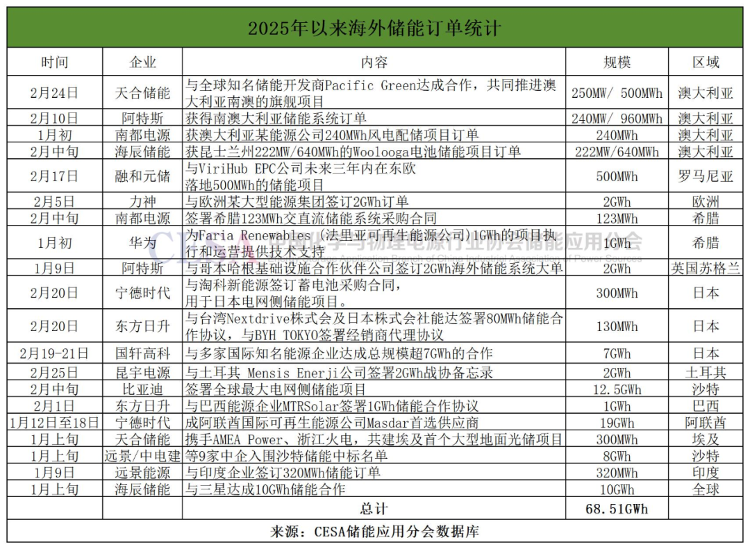 進入2025年,海外儲能市場熱度依舊不減,據(jù)CESA儲能應(yīng)用分會數(shù)據(jù)庫不完全統(tǒng)計,包括寧德時代、比亞迪、阿特斯、海辰儲能、東方日升儲能、天合儲能、南都電源、力神電池等企業(yè)在不到兩個月的時間內(nèi)共斬獲了20個儲能訂單,規(guī)模達68.51GWh,超過了去年全年中國企業(yè)在海外訂單總額的四份之一。