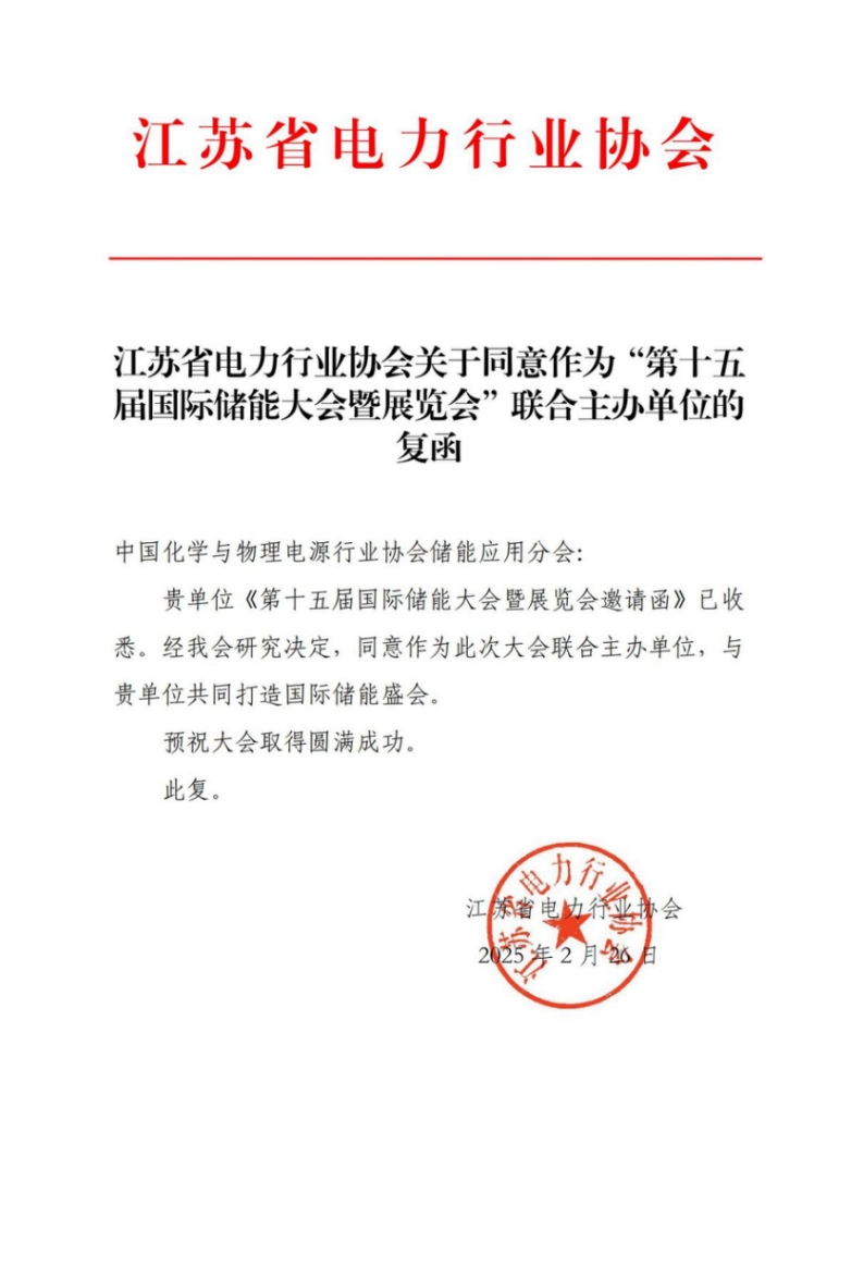 中國儲能網(wǎng)訊:近日,江蘇省電力行業(yè)協(xié)會復(fù)函中國化學(xué)與物理電源行業(yè)協(xié)會儲能應(yīng)用分會,同意作為第十五屆中國國際儲能大會暨展覽會(CIES2025)聯(lián)合主辦單位,與中國化學(xué)與物理電源行業(yè)協(xié)會儲能應(yīng)用分會共同打造這場國際儲能盛會。