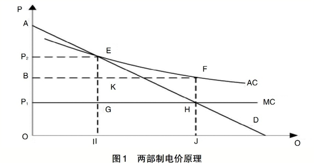 對于固定成本占比較大的商品定價(jià),政府管制最優(yōu)定價(jià)是采用兩部制定價(jià),固定成本通過與交易量無關(guān)的基本費(fèi)用回收,交易價(jià)格按單位變動(dòng)成本確定,全部變動(dòng)成本按交易量回收。如圖1所示,AC為平均成本曲線,MC為邊際成本曲線,D為用電需求曲線。由于需求曲線D與平均成本曲線AC的交點(diǎn)為E,按平均成本定價(jià)的價(jià)格為P2,平均成本定價(jià)下用電量是I,總成本為面積OP2EI,其中,P1P2EG為固定成本,OP1GI為變動(dòng)成本。需求曲線D與邊際成本曲線MC的交點(diǎn)是H,按照邊際成本定價(jià)的價(jià)格為P1,用電量是J,變動(dòng)成本為面積P1HJO。無論按邊際成本定價(jià)還是按平均成本定價(jià),固定成本不變,即矩形P1P2EG面積與矩形P1BFH面積相等。
