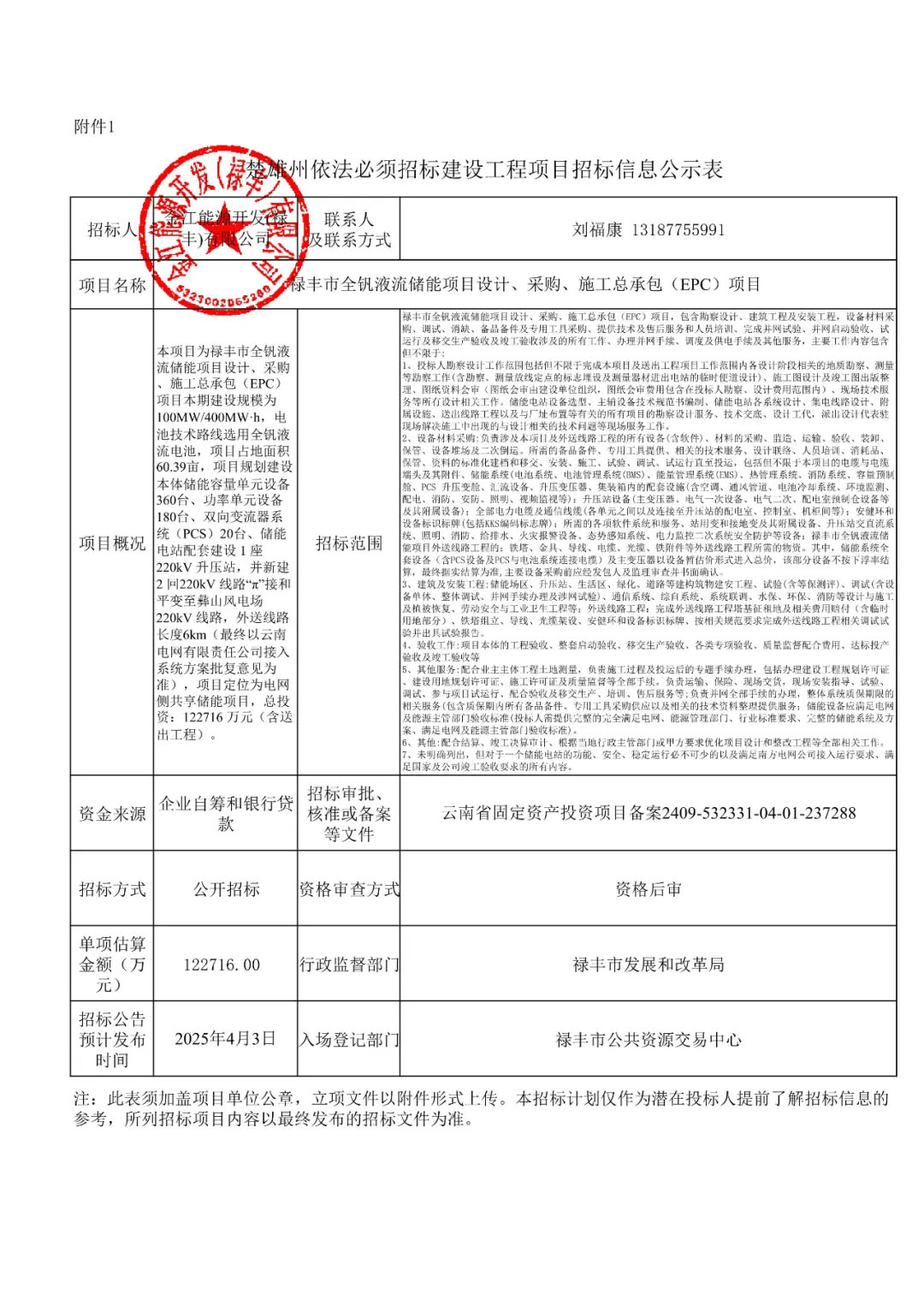 中國儲能網(wǎng)訊:3月3日,云南省公共資源交易信息網(wǎng)發(fā)布祿豐市全釩液流儲能項目設(shè)計、采購、施工總承包(EPC)項目招標計劃,總投資:122716萬元(含送出工程),折合單價:3.0679元/Wh,該招標公告預計于2025年4月3日發(fā)布。