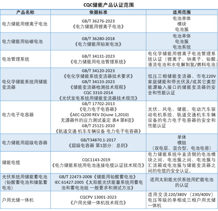 電力儲能產(chǎn)品認(rèn)證范圍包括:電力儲能用鋰離子電池、鉛炭電池、蓄電池、超級電容器、電池管理系統(tǒng)(BMS)、儲能變流器(PCS)、光儲一體機。CQC通過產(chǎn)品的型式檢驗、工廠檢查、獲證后監(jiān)督等流程,對儲能核心部件產(chǎn)品進(jìn)行全面的質(zhì)量監(jiān)督。