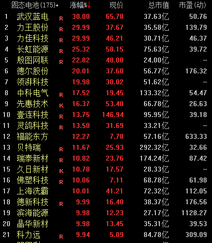 除北交所五只固態(tài)電池概念股漲幅超過(guò)20%外,德爾股份(SZ:300473)、領(lǐng)湃科技(SZ:300530)等漲幅居前,上海洗霸(SH:603200)三天三板,三祥新材(SH:603663)四天三板,東方鋯業(yè)(SZ:002167)兩天兩板。