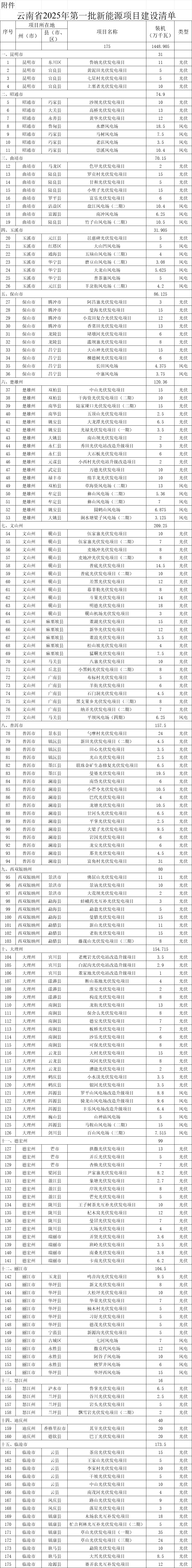 中國儲能網訊:3月3日,云南省發(fā)展和改革委員會、云南省能源局發(fā)布《關于印發(fā)云南省2025年第一批新能源項目開發(fā)建設方案的通知》(以下簡稱:通知)。根據通知,共175個項目納入2025年第一批,總規(guī)模為1448.905萬千瓦,包含光伏項目143個,裝機1203.4萬千瓦;風電項目32個,裝機245.505萬千瓦。