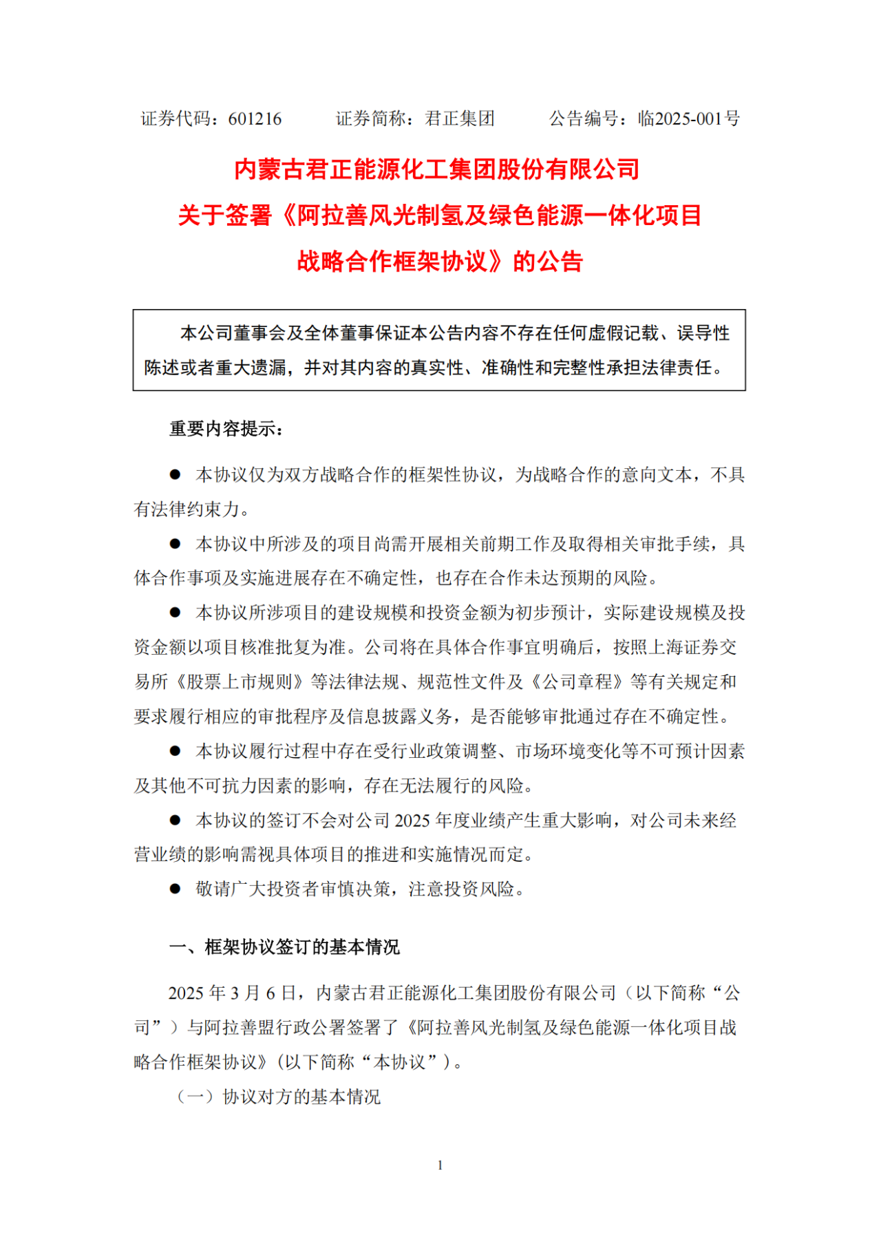 中國儲能網(wǎng)訊:3月6日,內(nèi)蒙古君正能源化工集團股份有限公司(簡稱:君正集團)發(fā)布關(guān)于簽署《阿拉善風(fēng)光制氫及綠色能源一體化項目戰(zhàn)略合作框架協(xié)議》的公告。