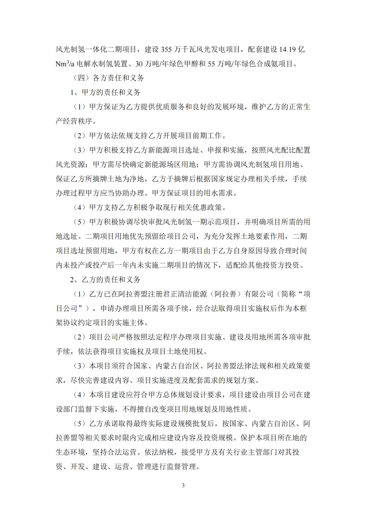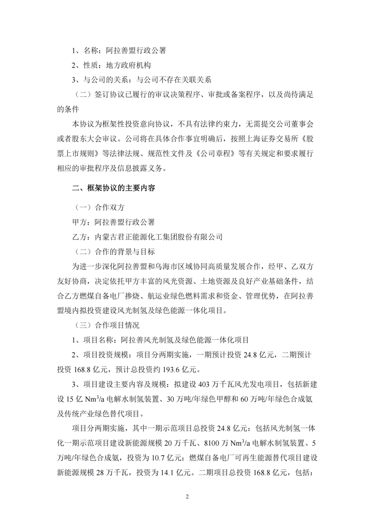 公告指出,為進一步深化阿拉善盟和烏海市區(qū)域協(xié)同高質(zhì)量發(fā)展合作,經(jīng)甲、乙雙方友好協(xié)商,決定依托甲方豐富的風(fēng)光資源、土地資源及良好產(chǎn)業(yè)基礎(chǔ)條件,結(jié)合乙方燃煤自備電廠摻燒、航運業(yè)綠色燃料需求和資金、管理優(yōu)勢,在阿拉善盟境內(nèi)擬投資建設(shè)風(fēng)光制氫及綠色能源一體化項目。