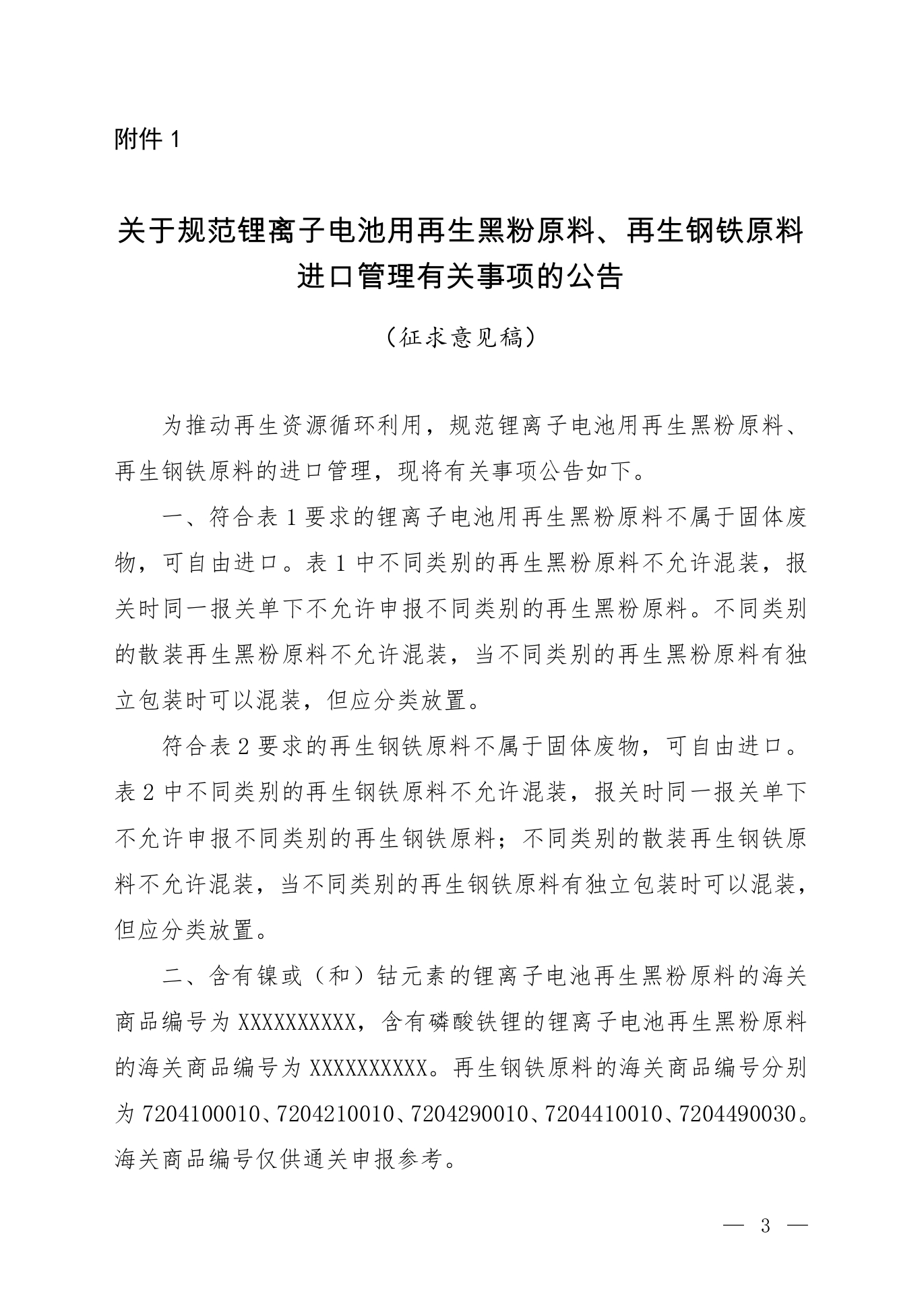 1.關(guān)于規(guī)范鋰離子電池用再生黑粉原料、再生鋼鐵原料進(jìn)口管理有關(guān)事項(xiàng)的公告(征求意見稿)