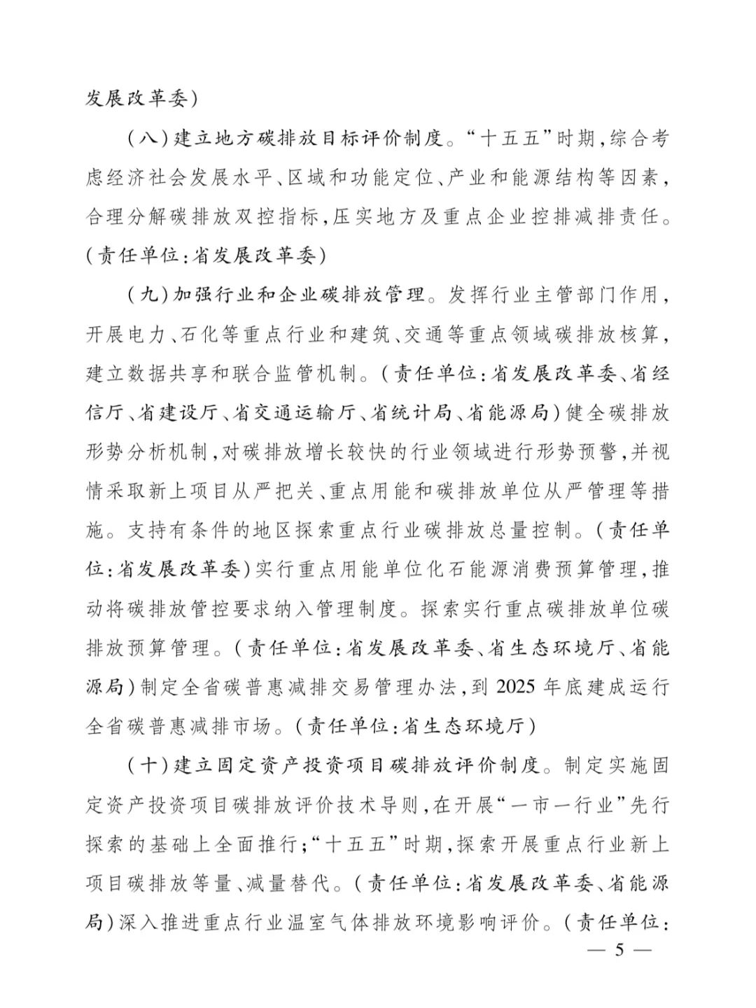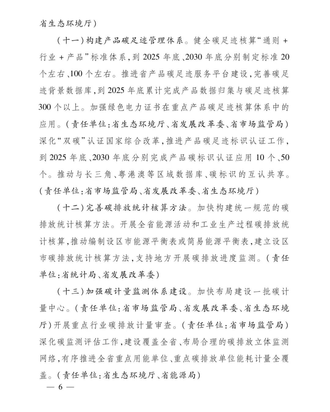 舉措明確對“十四五”期間的碳排放工作進行了總結(jié),碳排放雙控先行先試、碳排放預算管理編制探索、碳排放統(tǒng)計核算能力均取得了良好的成果。“十五五”時期,實施以強度控制為主、總量控制為輔的碳排放雙控制度,建立健全地方碳考核、區(qū)域碳預算、行業(yè)碳管控、企業(yè)碳管理、項目碳評價、產(chǎn)品碳足跡等配套制度,確保如期實現(xiàn)碳達峰目標。在推進碳減排重點工作上。要大力發(fā)展非化石能源,推進“光伏+”行動,有序推進核電、海上風電項目建設,大力發(fā)展生物質(zhì)能、地熱能、海洋能等新能源。到2025年底,新增風電光伏裝機600萬千瓦、核電裝機100萬千瓦,非化石能源消費占比(扣除原料用能和能耗單列項目用能)在24%左右;到2030年底,全省風電光伏、核電裝機分別達到8000萬千瓦、1800萬千瓦。
