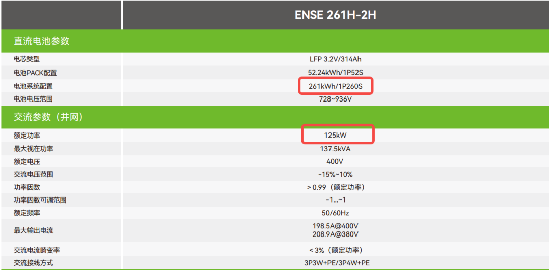 容量(MWh):由電池組的總能量密度和數(shù)量決定。例如,磷酸鐵鋰電池因高循環(huán)壽命成為主流選擇,單個集裝箱儲能單元可達1MWh,單個儲能一體柜目前主流電芯314Ah,1P260S表示1并260串,即為260 * 314Ah * 3.2V = 261kWh。