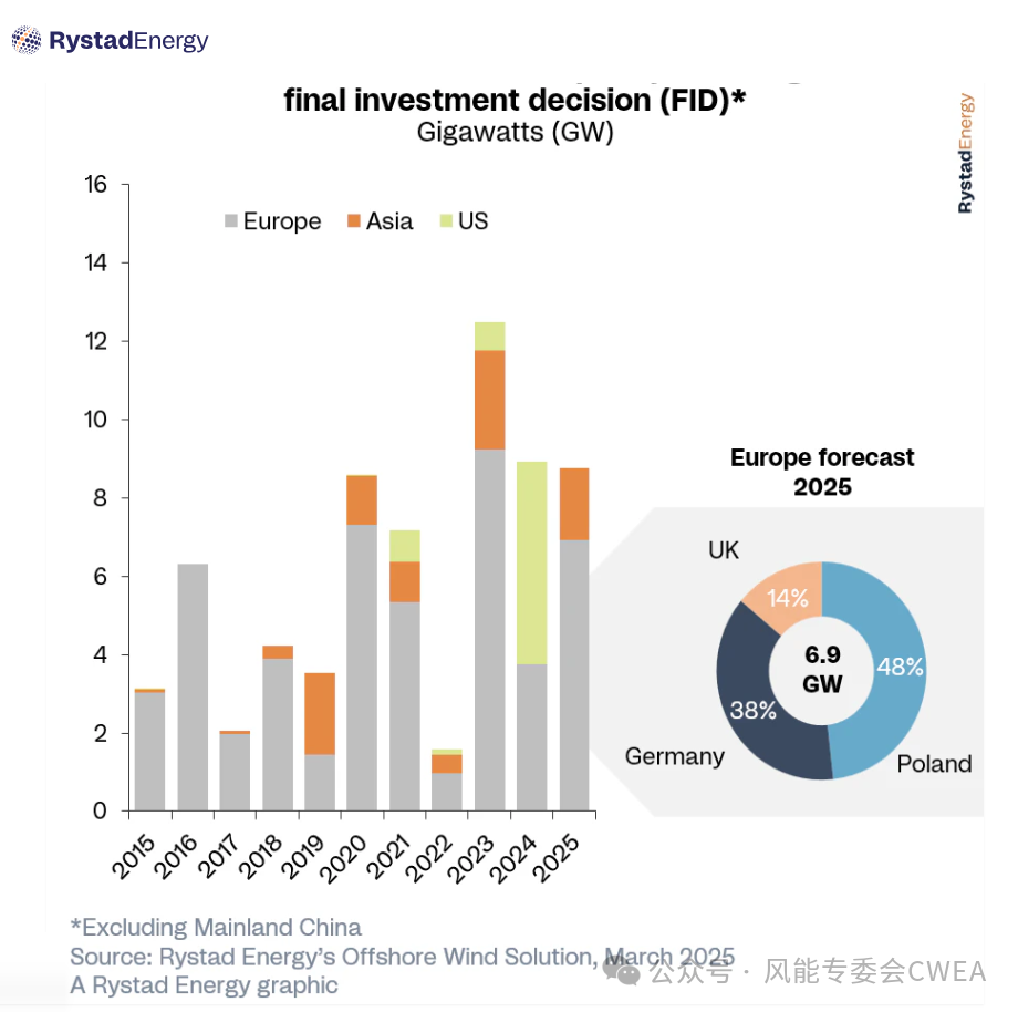 預(yù)計英國、波蘭和德國將在 2025 年引領(lǐng)歐洲最終投資決定的增長,將達到 9.5GW,這三個國家有多個項目正在等待最終批準。尤其是波蘭的多個大型風電場將獲得 FID,包括 Polenergia 和 Equinor 的 Baltyk II 和 III,Orsted 和 PGE 的 Baltica 2 項目。