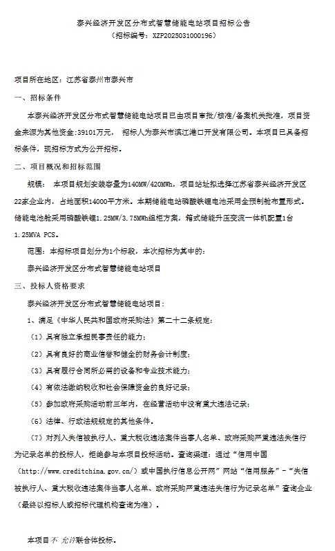 中國儲能網(wǎng)訊:3月10日,泰興市濱江港口開發(fā)有限公司發(fā)布了泰興經(jīng)濟(jì)開發(fā)區(qū)分布式智慧儲能電站項(xiàng)目招標(biāo)公告。本項(xiàng)目規(guī)劃安裝容量為140MW/420MWh,項(xiàng)目站址擬選擇江蘇省泰興經(jīng)濟(jì)開發(fā)區(qū)22家企業(yè)內(nèi),占地面積14000平方米。本期儲能電站磷酸鐵鋰電池采用全預(yù)制艙布置形式。儲能電池艙采用磷酸鐵鋰1.25MW/3.75MWh組柜方案,箱式儲能升壓變流一體機(jī)配置1臺1.25MVA PCS。