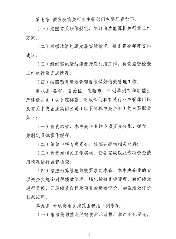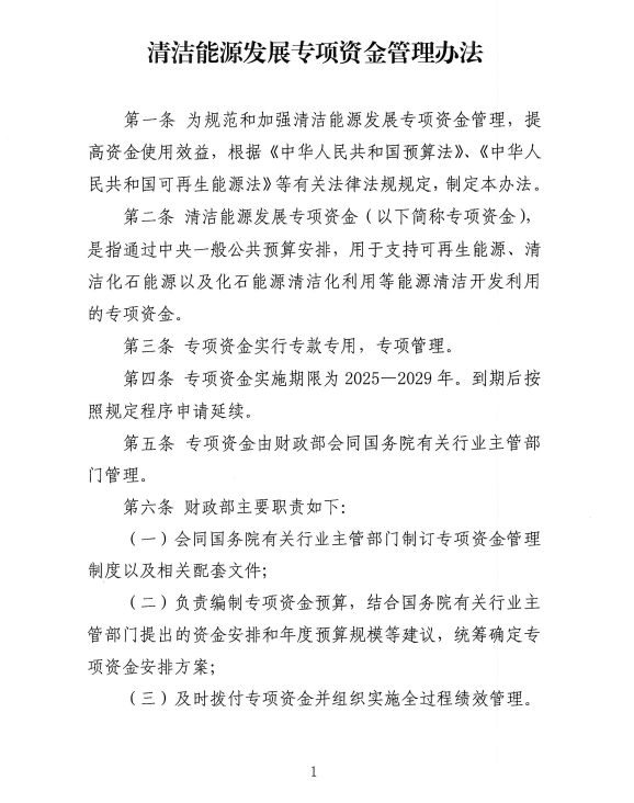 《辦法》規(guī)定,專項(xiàng)資金通過中央一般公共預(yù)算安排,用于支持可再生能源、清潔化石能源以及化石能源清潔化利用等能源清潔開發(fā)利用,實(shí)行??顚S?,專項(xiàng)管理。