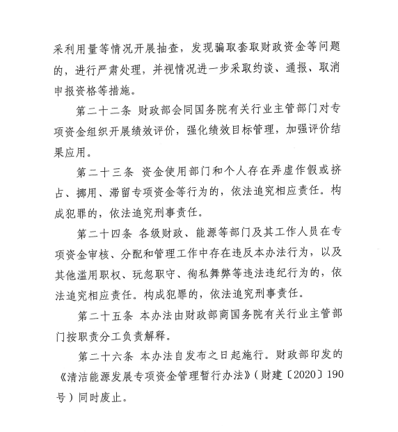 中國儲(chǔ)能網(wǎng)訊:3月12日,財(cái)政部印發(fā)《清潔能源發(fā)展專項(xiàng)資金管理辦法》(財(cái)建〔2025〕35號(hào)),要求規(guī)范和加強(qiáng)清潔能源發(fā)展專項(xiàng)資金管理,提高資金使用效益?!掇k法》自發(fā)布之日起施行,此前財(cái)政部印發(fā)的《清潔能源發(fā)展專項(xiàng)資金管理暫行辦法》(財(cái)建〔2020〕190號(hào))同時(shí)廢止。