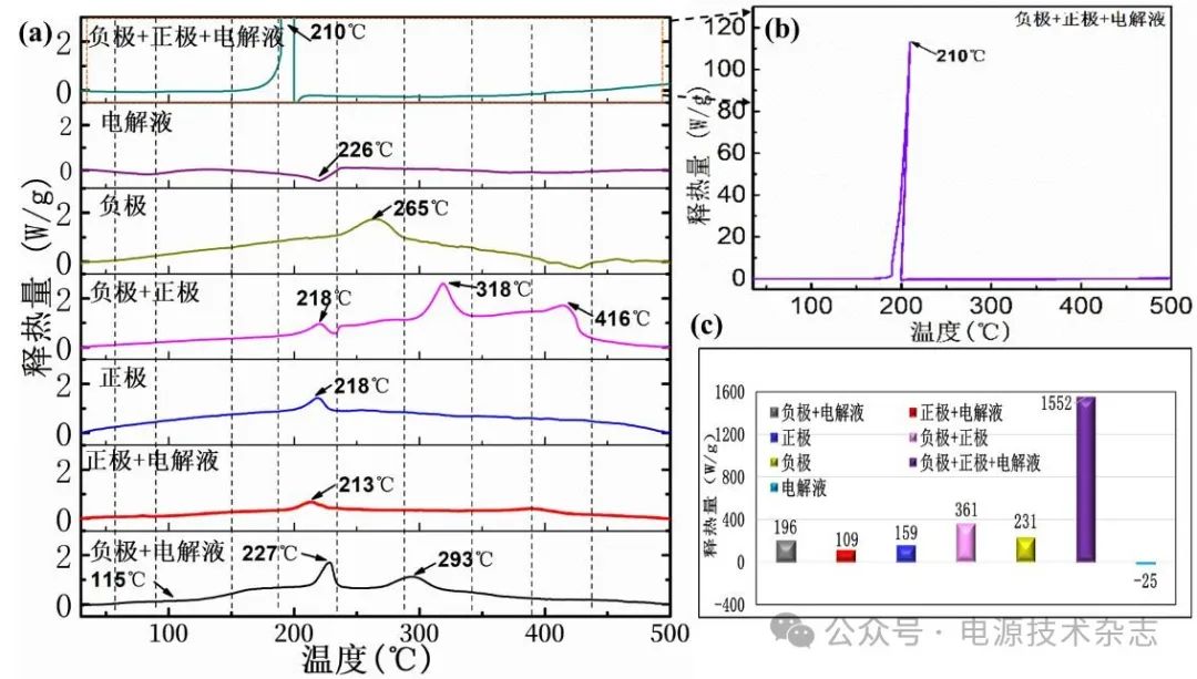 圖1滿電態(tài)(100 % SOC)NCM811/SiC@石墨軟包電池(3.3 Ah)各組件的釋熱時(shí)序圖(a)、100% SOC下負(fù)極+正極+電解液的全貌圖(b)與100% SOC下NCM811/SiC@石墨軟包電池(3.3 Ah)各組件的釋熱量大小對(duì)比圖(c)