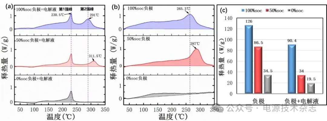 圖2 不同荷電態(tài)下的負(fù)極+電解液(a)、負(fù)極(b)的釋熱溫度時(shí)序以及不同荷電態(tài)下負(fù)極與負(fù)極+電解液的釋熱量對(duì)比圖(c)