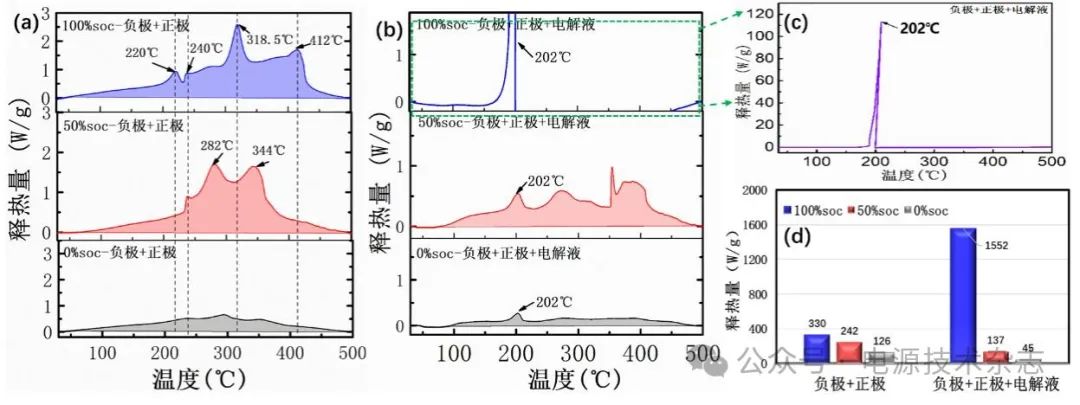 圖3 不同荷電態(tài)下的負(fù)極+正極(a)、負(fù)極+正極+電解液的釋熱溫度時(shí)序(b)、100% SOC負(fù)極+正極+電解液的全貌圖(c)以及不同荷電狀態(tài)下負(fù)極+正極與負(fù)極+正極+電解液的釋熱量對(duì)比圖(d)
