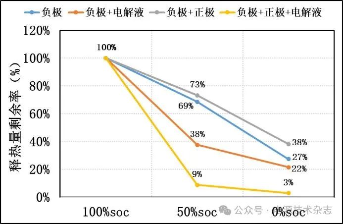圖4 不同SOC下嵌鋰硅碳@石墨與其對(duì)應(yīng)的電池各組件發(fā)生釋熱反應(yīng)后的釋熱量剩余率對(duì)比圖