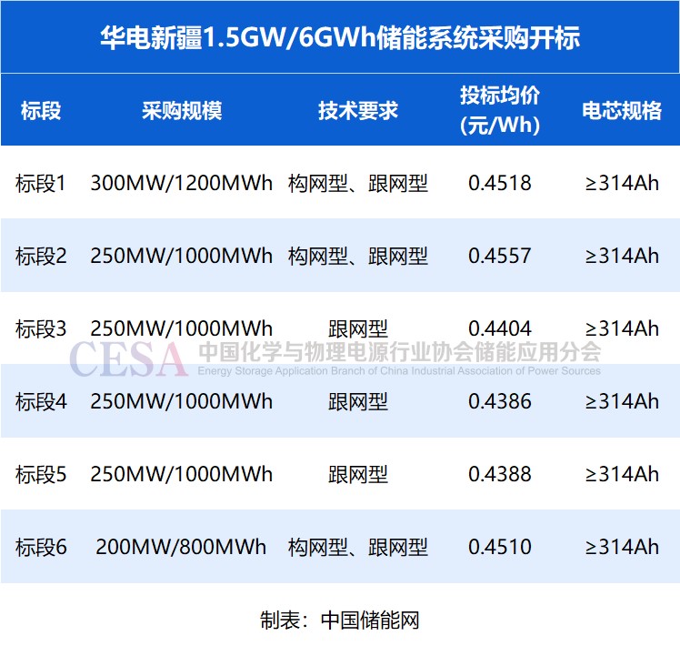 儲(chǔ)能系統(tǒng)包括構(gòu)網(wǎng)型+跟網(wǎng)型技術(shù)、跟網(wǎng)型技術(shù)兩種類型。其中,標(biāo)段一、二、六為構(gòu)網(wǎng)型+跟網(wǎng)型儲(chǔ)能系統(tǒng)采購,投標(biāo)報(bào)價(jià)均價(jià)為0.45285元/Wh,標(biāo)段三-五為跟網(wǎng)型儲(chǔ)能系統(tǒng)采購,投標(biāo)均價(jià)為0.4392元/Wh。