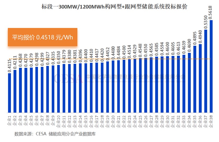 共38家企業(yè)競標(biāo),投標(biāo)報(bào)價(jià)在0.4115-0.5618元/Wh區(qū)間內(nèi),投標(biāo)均價(jià)0.4518元/Wh。
