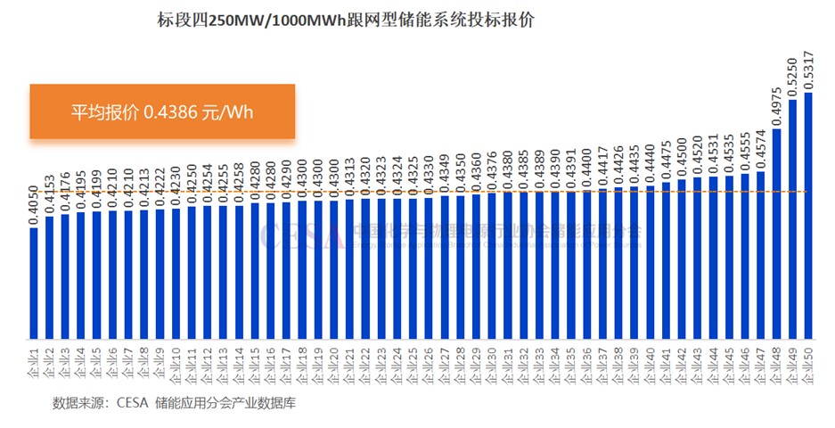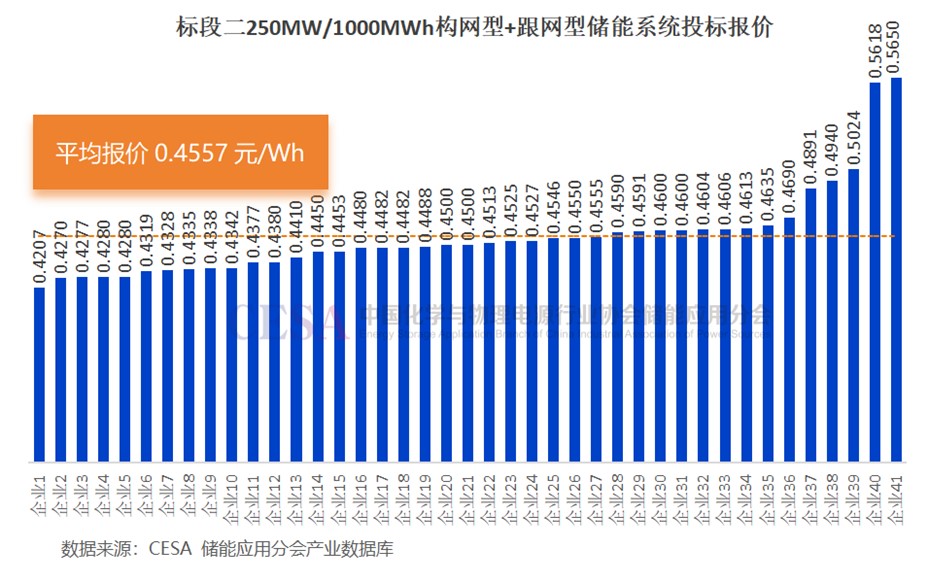 共41家企業(yè)參與競標(biāo),投標(biāo)報(bào)價(jià)在0.4207-0.5650元/Wh范圍內(nèi),投標(biāo)均價(jià)0.4557元/Wh。