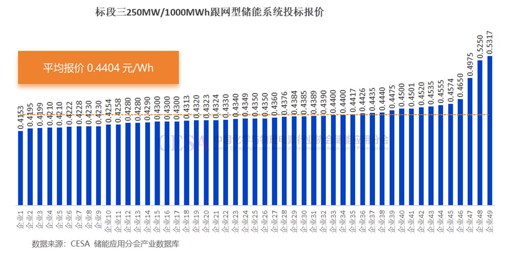 共49家企業(yè)競標(biāo),投標(biāo)報(bào)價(jià)在0.4153-0.5317元/Wh區(qū)間內(nèi),投標(biāo)均價(jià)0.4404元/Wh。