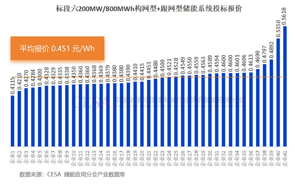 共41家企業(yè)參與競標(biāo),投標(biāo)報(bào)價(jià)在0.427-0.5618元/Wh區(qū)間內(nèi),均價(jià)0.451元/Wh。