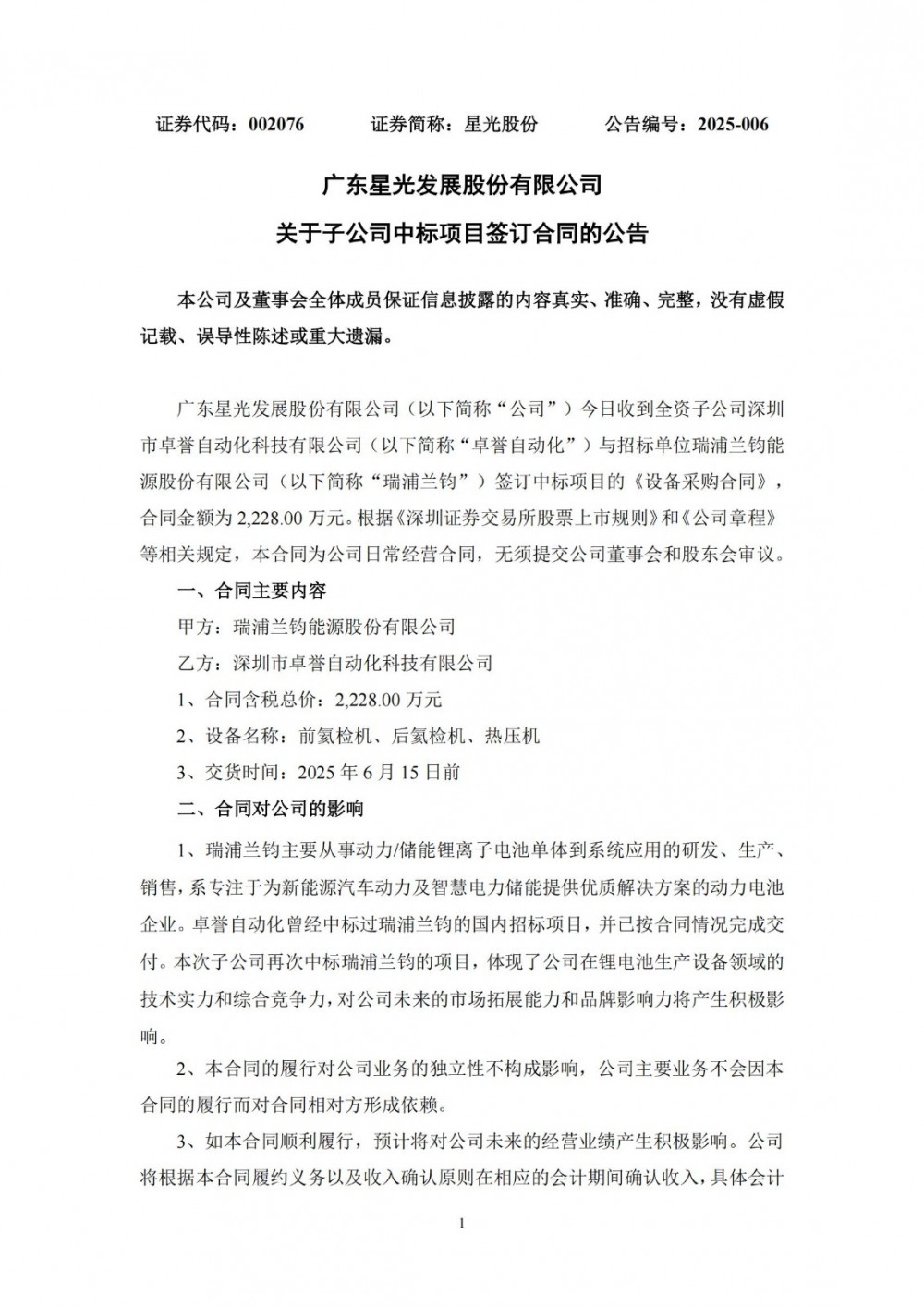 中國(guó)儲(chǔ)能網(wǎng)訊:近日,星光股份發(fā)布公告稱(chēng),公司全資子公司深圳市卓譽(yù)自動(dòng)化科技有限公司與招標(biāo)單位瑞浦蘭鈞能源股份有限公司簽訂中標(biāo)項(xiàng)目的《設(shè)備采購(gòu)合同》,合同金額為2228萬(wàn)元。設(shè)備名稱(chēng)為前氦檢機(jī)、后氦檢機(jī)、熱壓機(jī),交貨時(shí)間2025年6月15日前。
