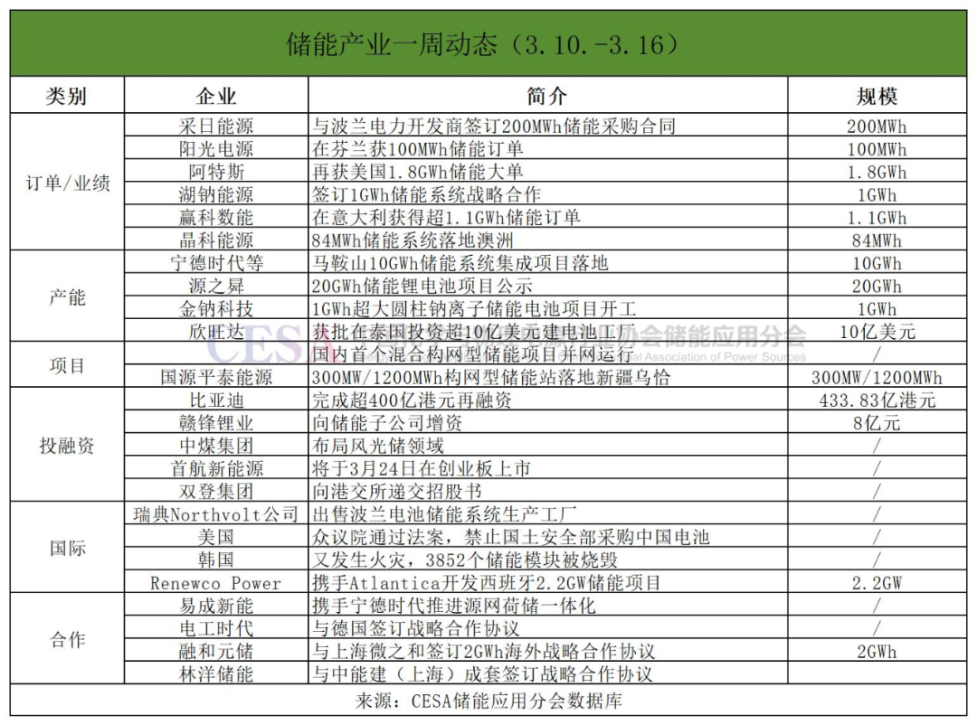投融資方面,比亞迪完成超400億港元再融資;江西“鋰王”贛鋒鋰業(yè)向儲(chǔ)能子公司增資;首航新能源將于3月24日上市;雙登集團(tuán)向港交所遞交招股書(shū)。